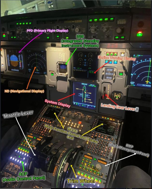 - MCDU (Unidade Multifuncional de Controle e Exibição): Interface para inserir detalhes do plano de voo e gerenciar os sistemas da aeronave.