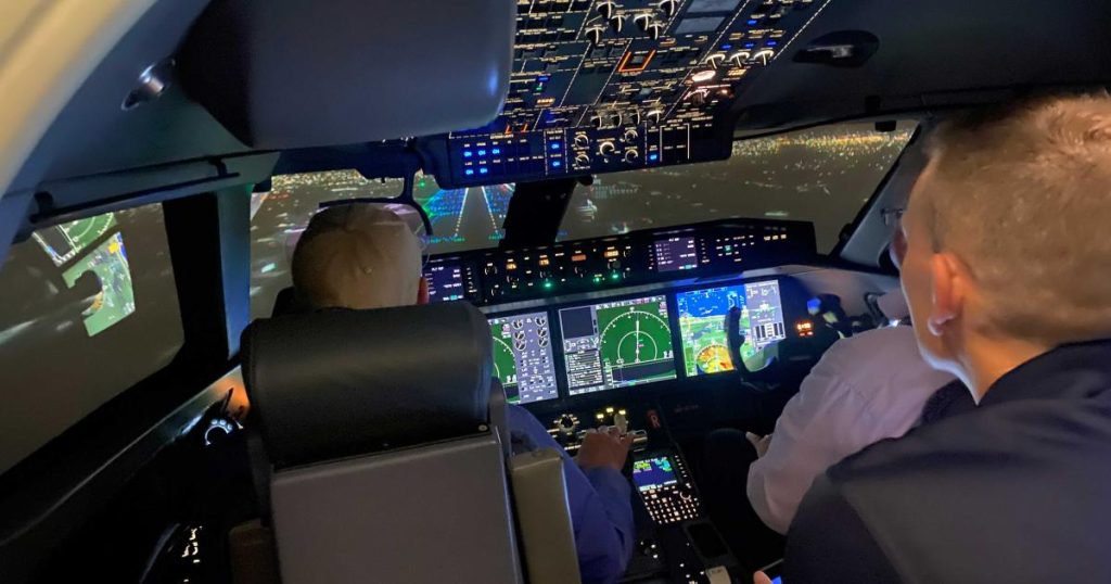 Não estávamos em um avião, mas voando uma série de abordagens visuais guiadas por FMS (FGV) no simulador G650 nível D da FlightSafety International no centro de aprendizado de Long Beach, Califórnia.